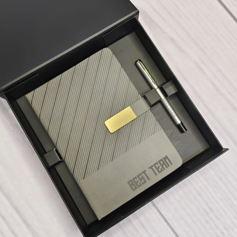 Employee Recognition Gifts, Celebrate outstanding performance with our Corporate Notebook & Pen Set – HR Edition. Designed to recognise and motivate team members, this set pairs a high-quality A5 notebook with a matching pen, both ready for custom branding — whether it’s your company logo, employee names, or a thank-you message. The notebook features durable covers (PU leather or eco finish) and smooth, lined paper suited for note-taking, planning, and journaling. The pen offers a comfortable, premium writing experience. Packaged in a classy gift box, this set is ideal for staff appreciation, onboarding, performance awards, or HR welcome kits. With every use, your brand stays visible while your employees feel valued. A thoughtful, useful gift that builds both productivity and loyalty.